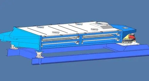 傾角為4-9度的篩箱由驅(qū)動箱傳動,其運動軌跡在進料端為水平圓運動,在長度方向上逐漸變成橢圓運動,*后在出料端變成近似往復直線運動。